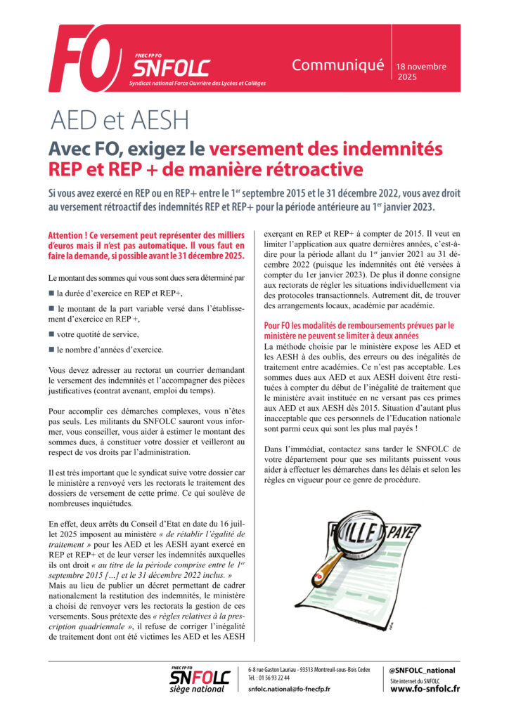 AED et AESH – Avec FO, exigez le versement des indemnités REP et REP+ de manière rétroactive