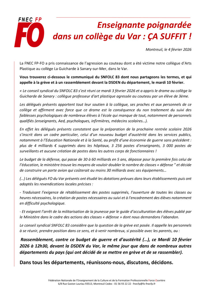 Enseignante poignardée dans un collège du Var : ça suffit ! de SNFOLC Toulouse On 10 février 2026 26 02 04 – Enseignante poignardée dans un collège du Var – ça suffitTélécharger FNEC FP FO Précédent Loi 3DS : Non au transfert des Secrétaires Généraux d’EPLE aux collectivités locales ! Suivant La FNEC FP-FO refuse de participer à la destruction de la santé scolaire